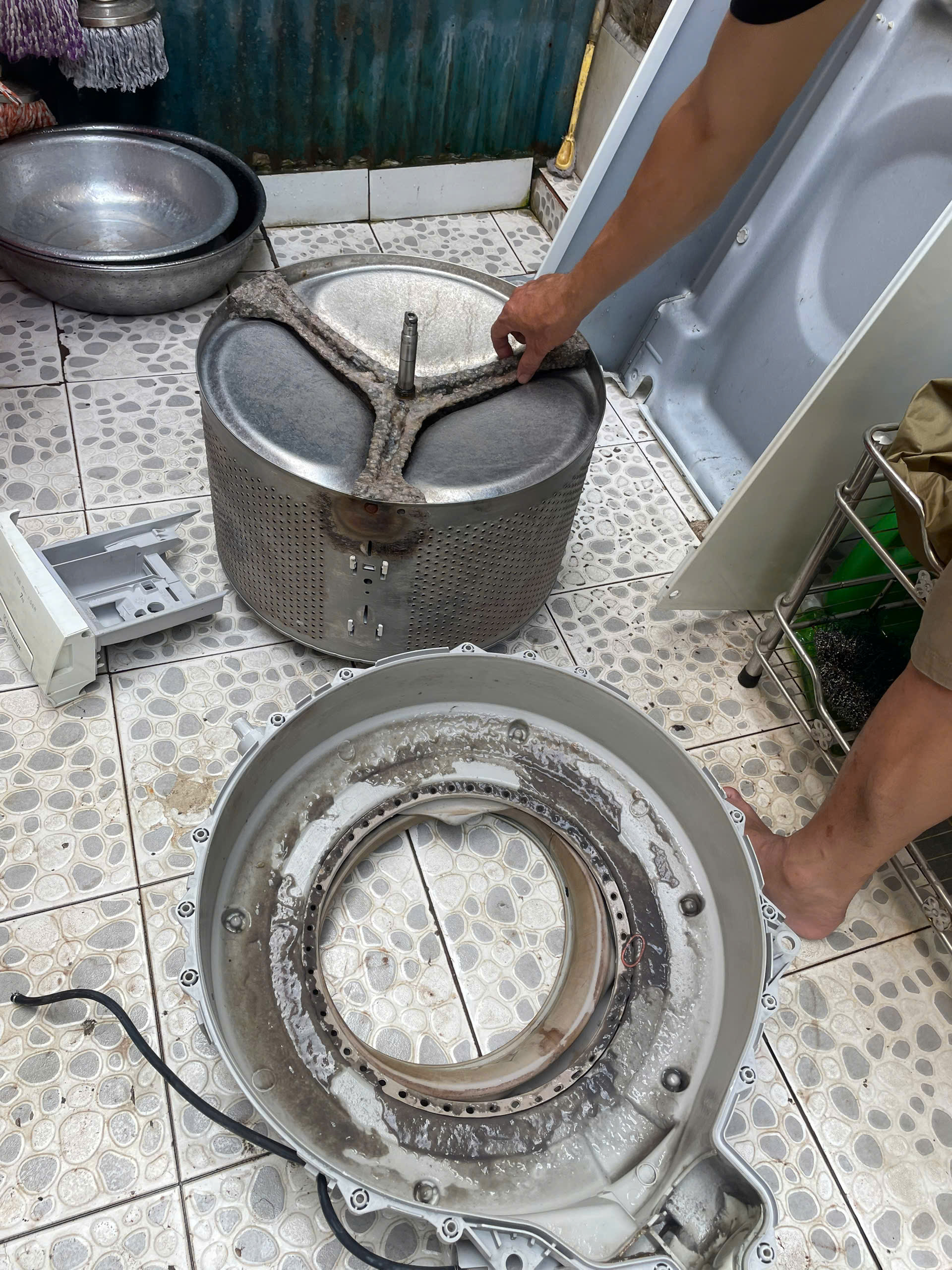 Lồng giặt sẽ được tháo ra để vệ sinh sâu bên trong – nơi tích tụ nhiều cặn bẩn và vi khuẩn nhất.